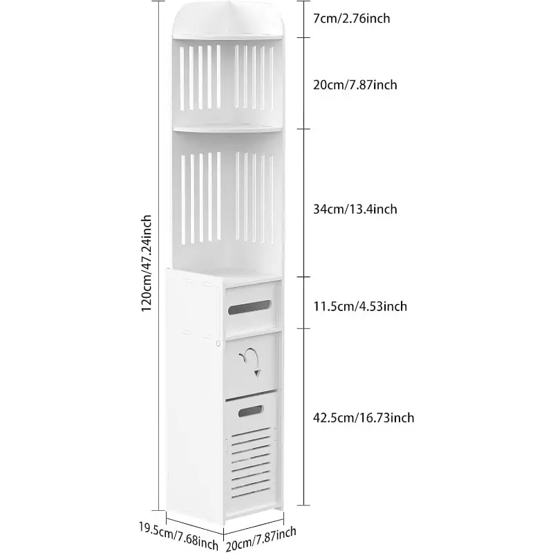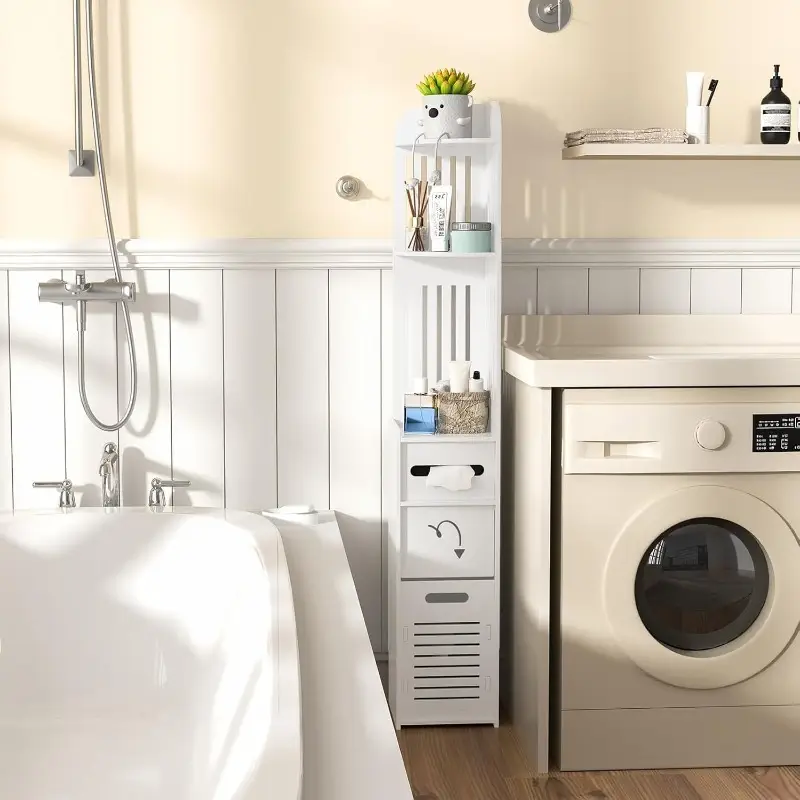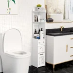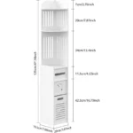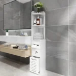 – Space-Saving Narrow Storage Cabinet, White Modern Design with Open Shelves & Door.